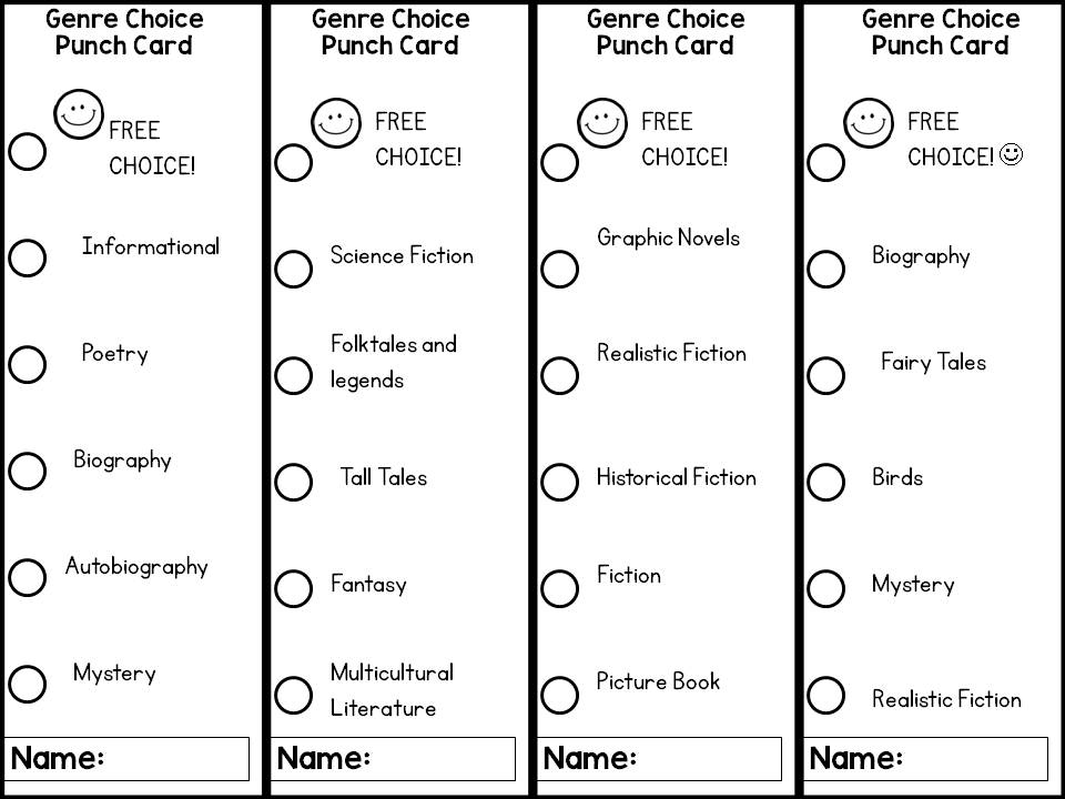 I give the students one bookmark and they explore the classroom library, once they find a book that matches one item on their bookmark, they bring me the book and they get a punch! These bookmarks match my classroom library book bin labels.