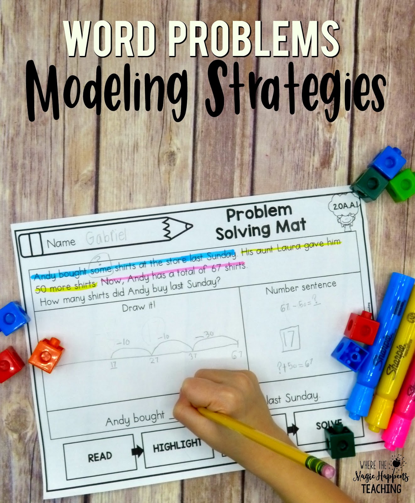 - Modeling–> Direct modeling must be your step #1 in helping your students understand and develop a sense of context and relationships when learning how to solve word problems. I wrote about helping students discover the relationships in story problems HERE. You cannot expect your students to use and apply any strategy without modeling it first. Let the kids use their fingers if they are in K or 1st, or even if they have not had enough exposure to addition and subtraction situations. They will need LOTS of opportunities to interact, listen, fail, and succeed. Some modeling strategies are: using fingers, drawings, or using actual objects.